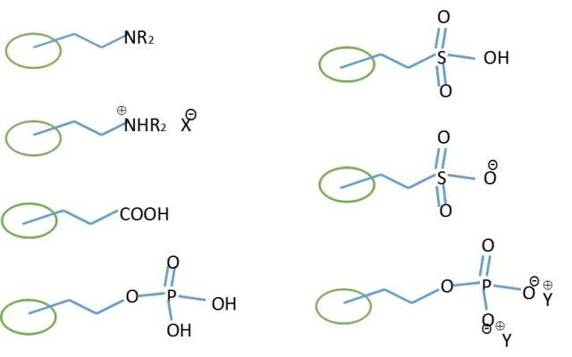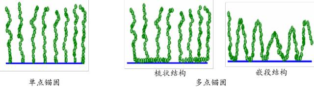超分散劑的結構。分子結構按其具有的性質和功能可分為兩部分:一部分為錨固基團:如-NR2、-NR3+、-COOH、-SO3H、-PO4H2、-SO3-、-PO42-、多元胺、多元醇及聚醚等(如圖),它通過離子鍵、共價鍵、氫鍵及范德華力等作用形式緊緊地吸附于顆粒表面,不易脫附,錨固段在整個超分散劑分子結構中所占比例很小,一般占10